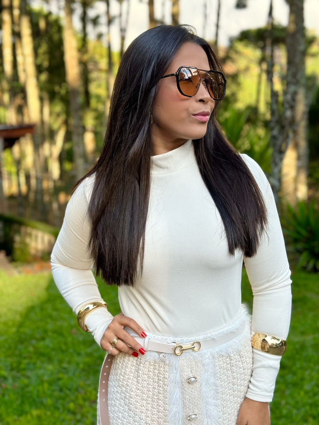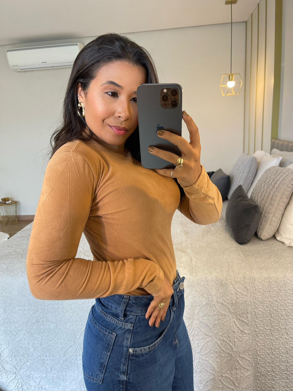 Esta blusa é confeccionada em tecido aveludado de alta qualidade, que proporciona um toque macio, aconchegante e extremamente confortável. O material se ajusta suavemente ao corpo, garantindo elegância e liberdade de movimento sem apertar.
