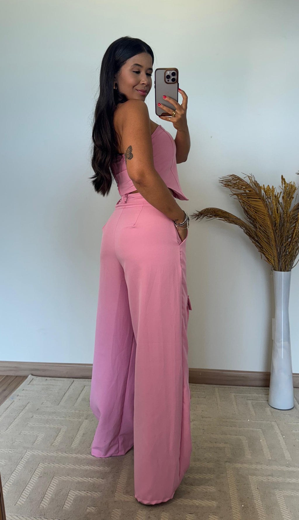 O Conjunto Bella une estilo, conforto e modernidade em uma única produção poderosa. Composto por um top tomara que caia de corte assimétrico e uma calça cargo ampla, ele entrega tendência e personalidade em cada detalhe.