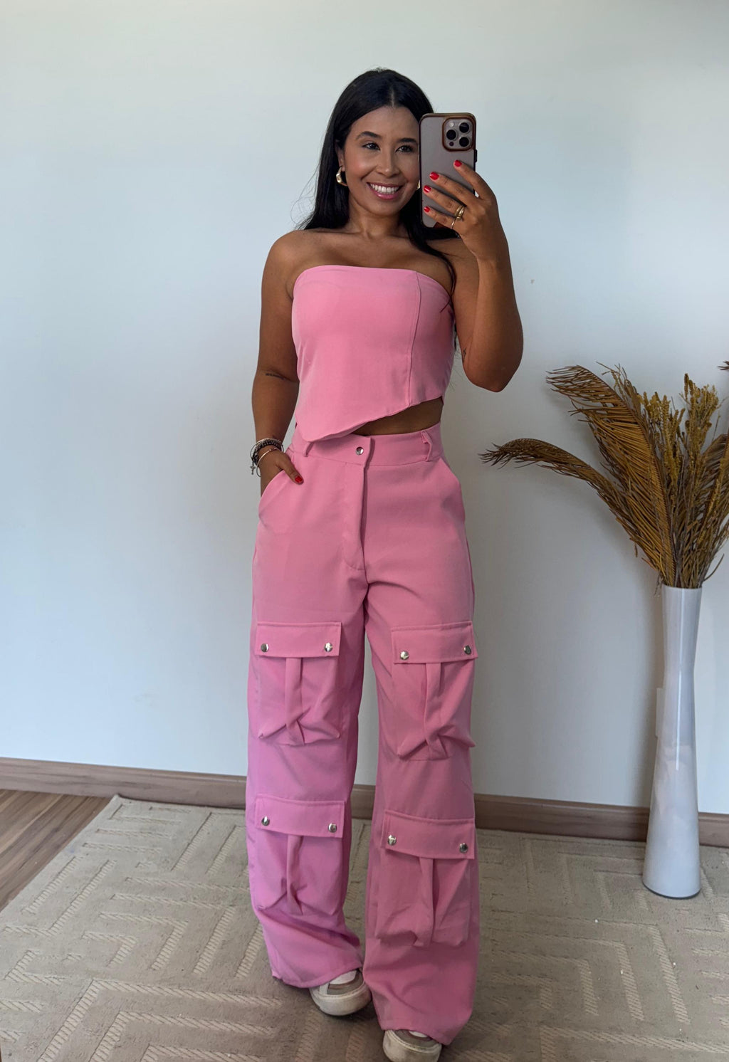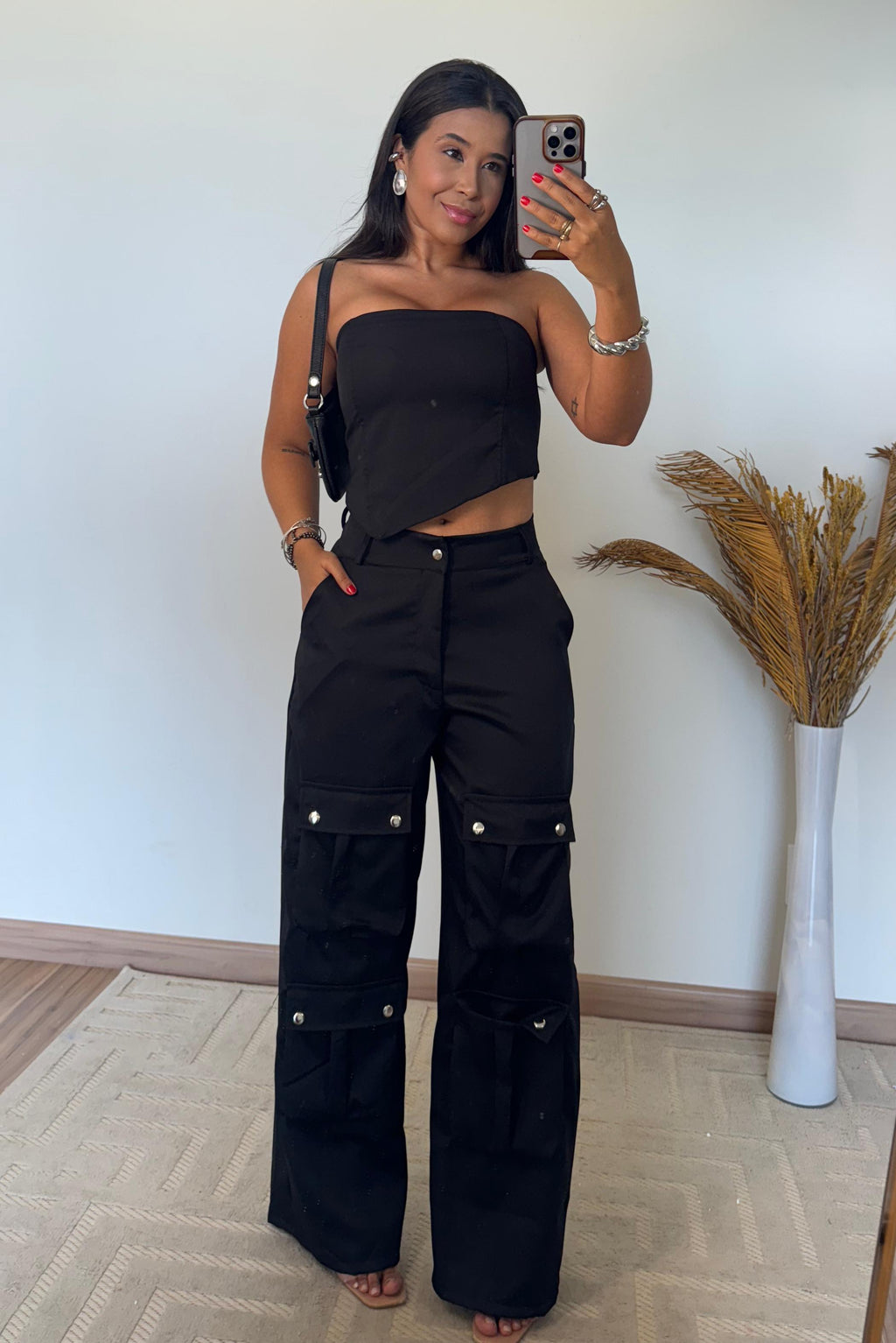 O top possui caimento estruturado que valoriza o busto e traz um toque sofisticado ao visual. Já a calça cargo conta com bolsos utilitários, modelagem reta e cintura média, proporcionando um look contemporâneo, confortável e super versátil.