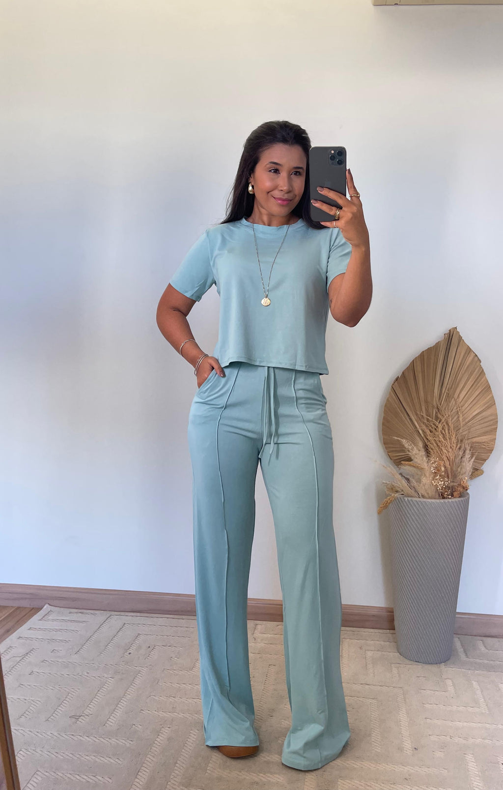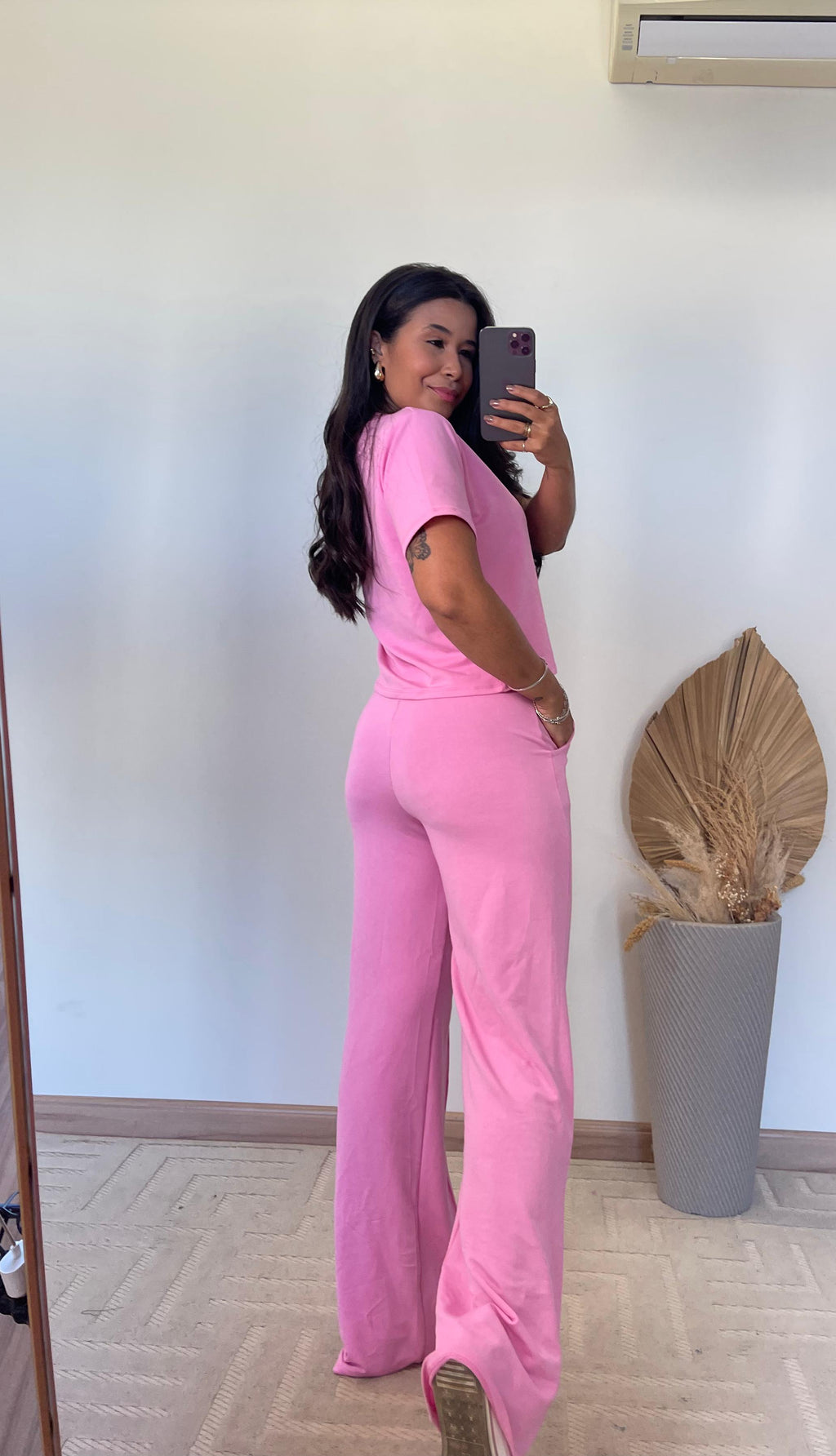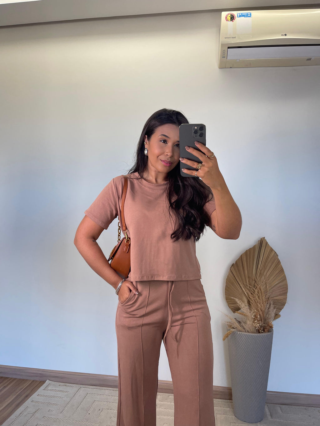 Este conjunto é confeccionado em tecido de malha, um material confortável e flexível, ideal para quem deseja liberdade nos movimentos sem abrir mão do estilo.