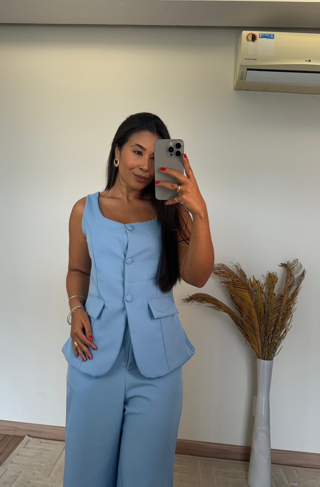 ✔ Conjunto composto por colete acinturado e calça pantalona