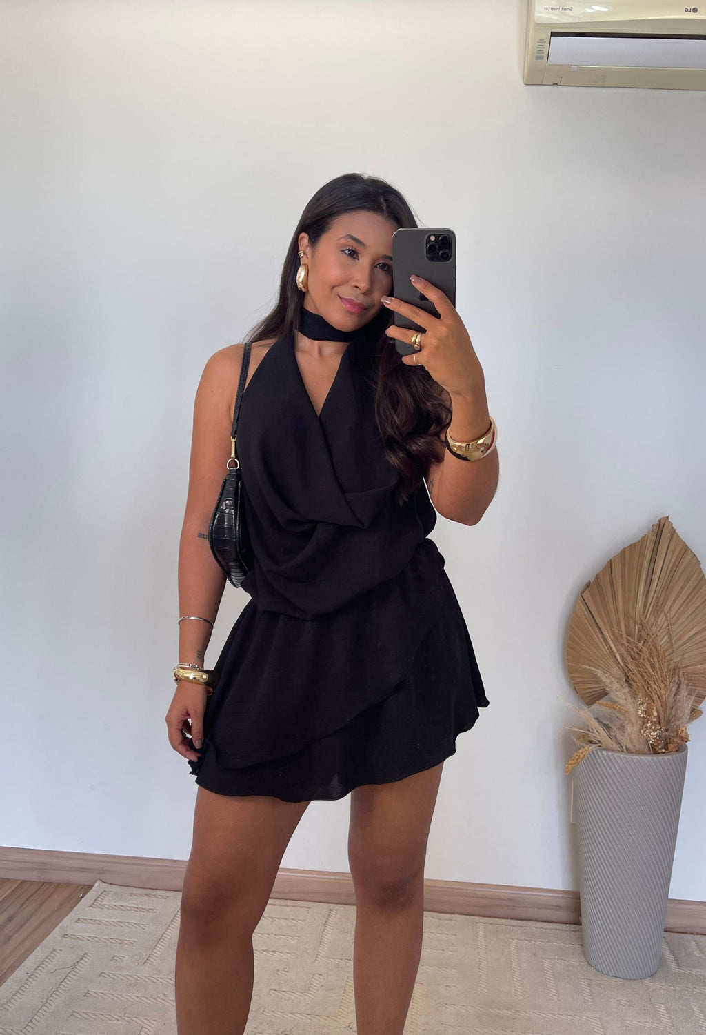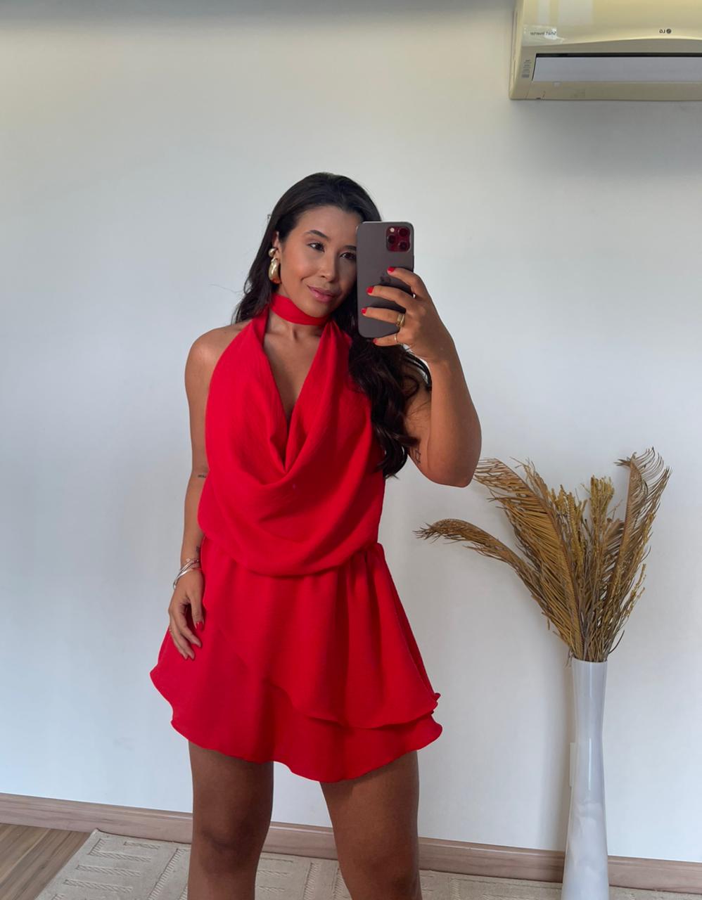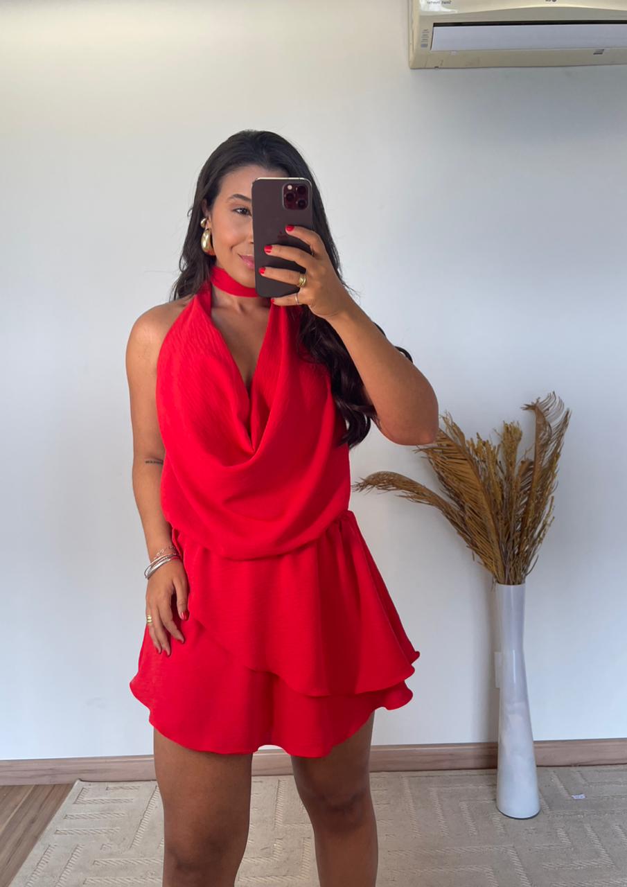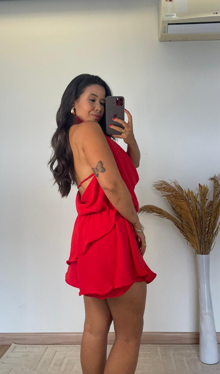 O modelo apresenta frente única com gola boba, um toque fashion que valoriza o colo e traz fluidez ao visual. Nas costas, o decote profundo imprime sensualidade na medida certa, ideal para ocasiões especiais ou dias ensolarados. Seu caimento leve e os babados delicados criam movimento e romantismo, tornando o look mais feminino e marcante.