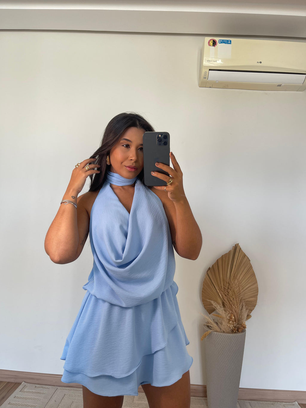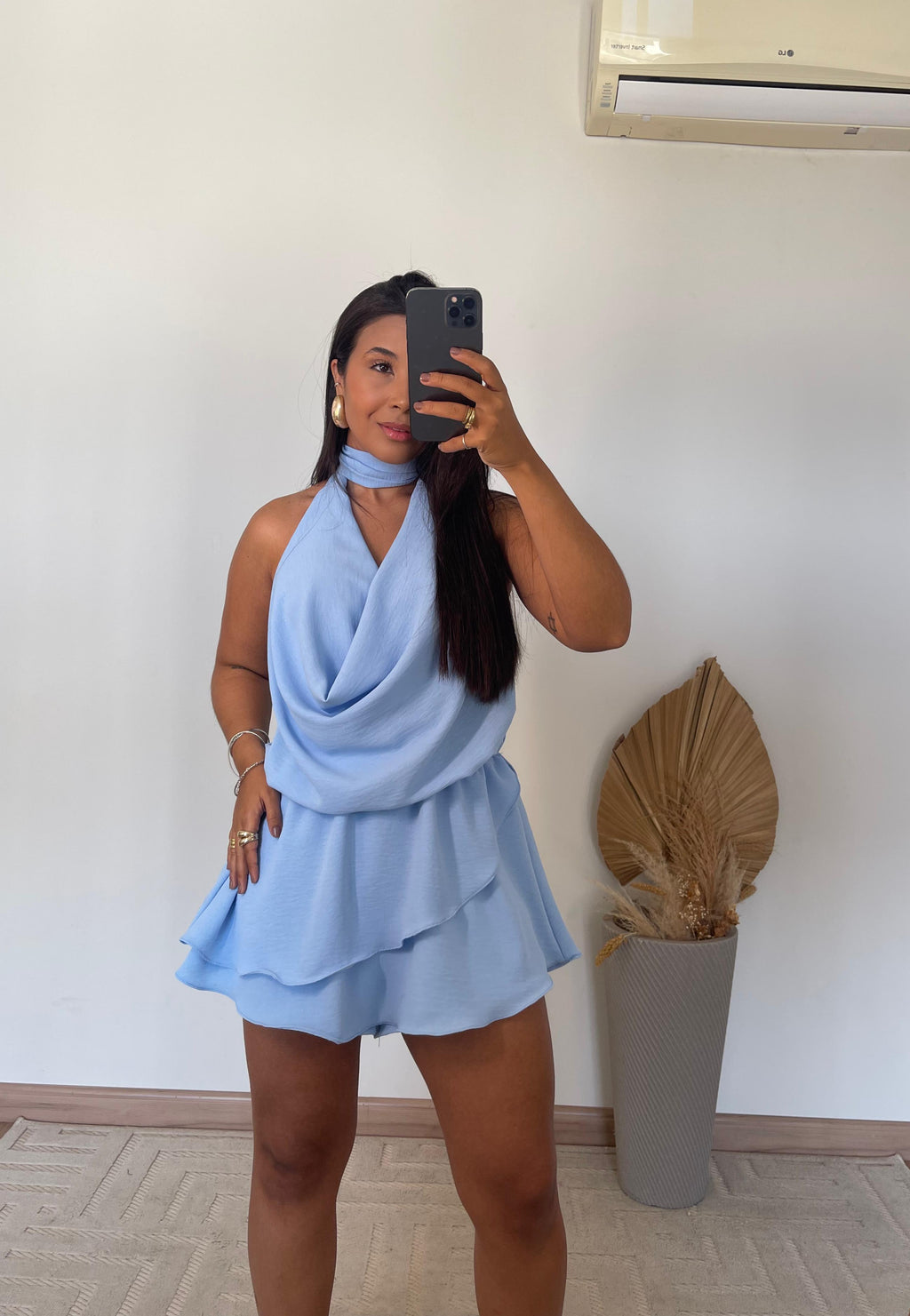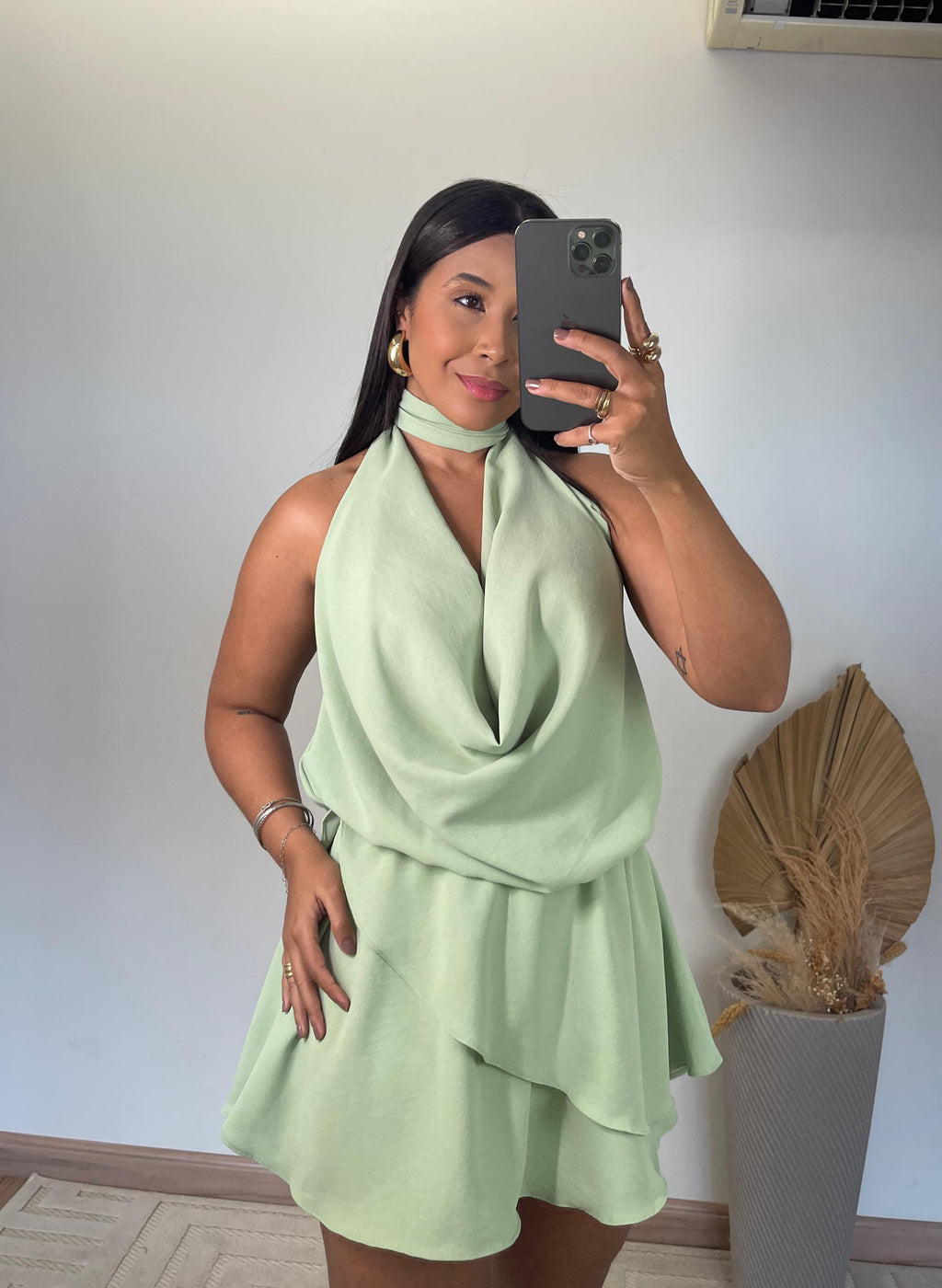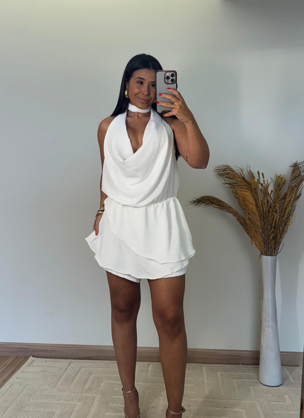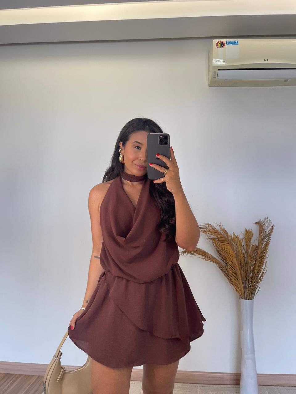 O modelo apresenta frente única com gola boba, um toque fashion que valoriza o colo e traz fluidez ao visual. Nas costas, o decote profundo imprime sensualidade na medida certa, ideal para ocasiões especiais ou dias ensolarados. Seu caimento leve e os babados delicados criam movimento e romantismo, tornando o look mais feminino e marcante.