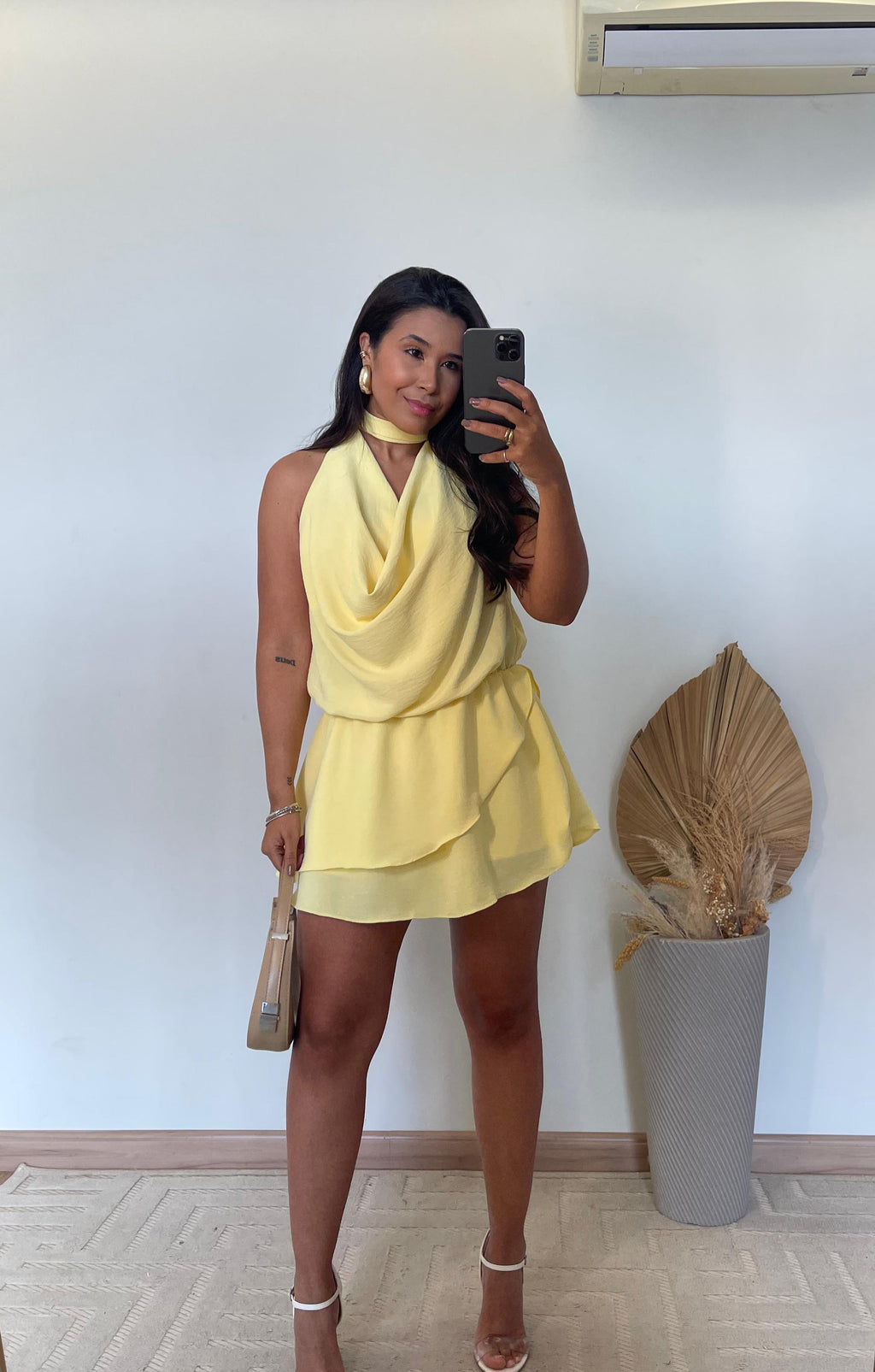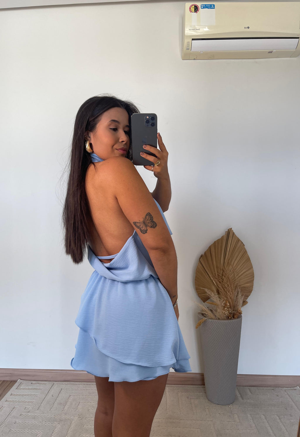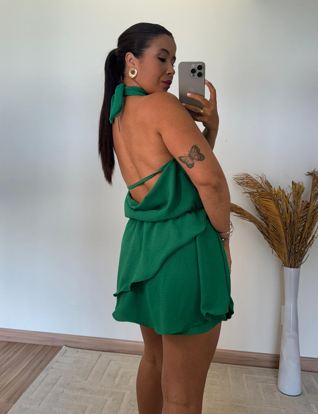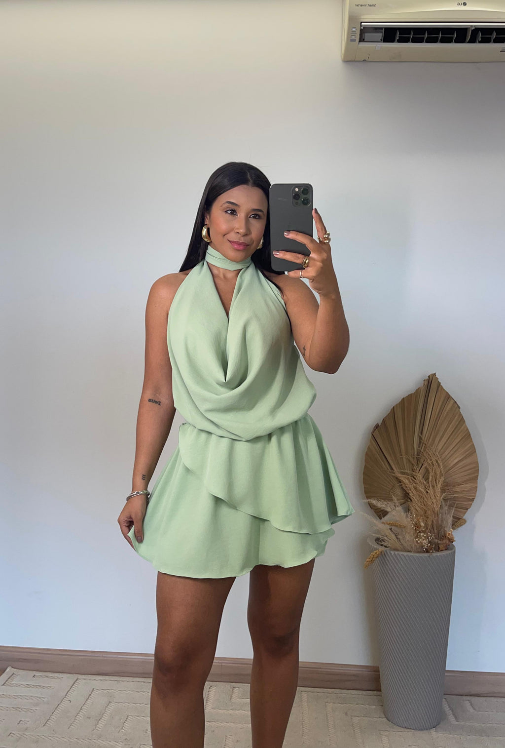 O modelo apresenta frente única com gola boba, um toque fashion que valoriza o colo e traz fluidez ao visual. Nas costas, o decote profundo imprime sensualidade na medida certa, ideal para ocasiões especiais ou dias ensolarados. Seu caimento leve e os babados delicados criam movimento e romantismo, tornando o look mais feminino e marcante.