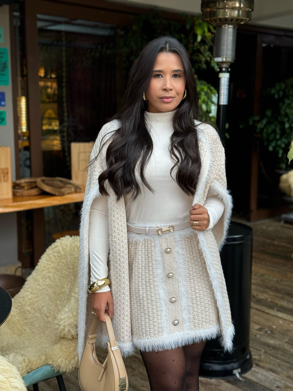 O Conjunto Alice é uma combinação perfeita de estilo e conforto para mulheres que amam se destacar com delicadeza. Composto por um casaco tipo capa e uma saia elegante, esse conjunto é confeccionado em tricot de alta qualidade, oferecendo um toque suave, quentinho e extremamente confortável