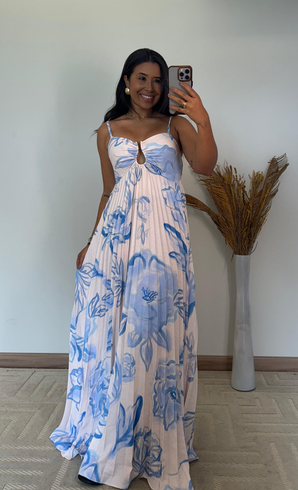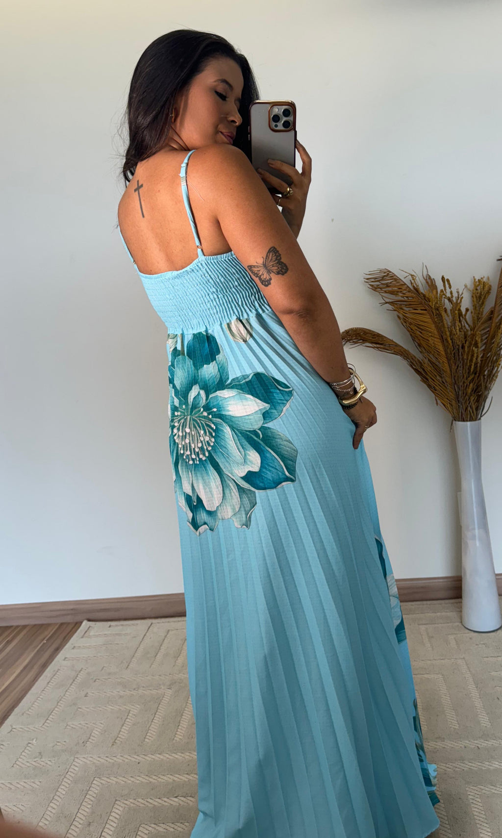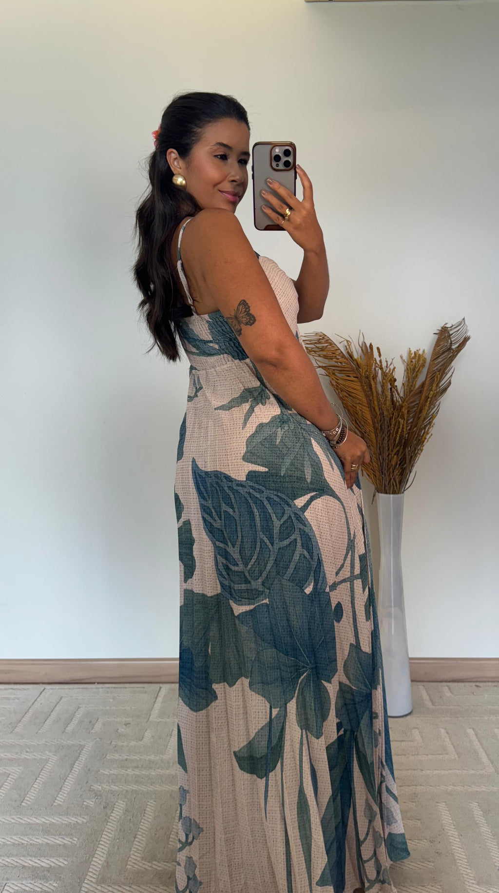 Seu modelo longo com estampa floral exclusiva traz um ar romântico e sofisticado, perfeito para ocasiões especiais, passeios ou eventos ao ar livre.