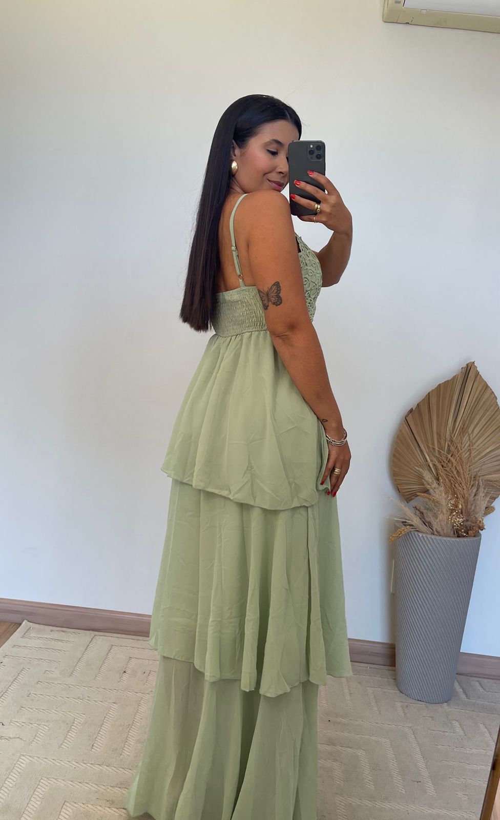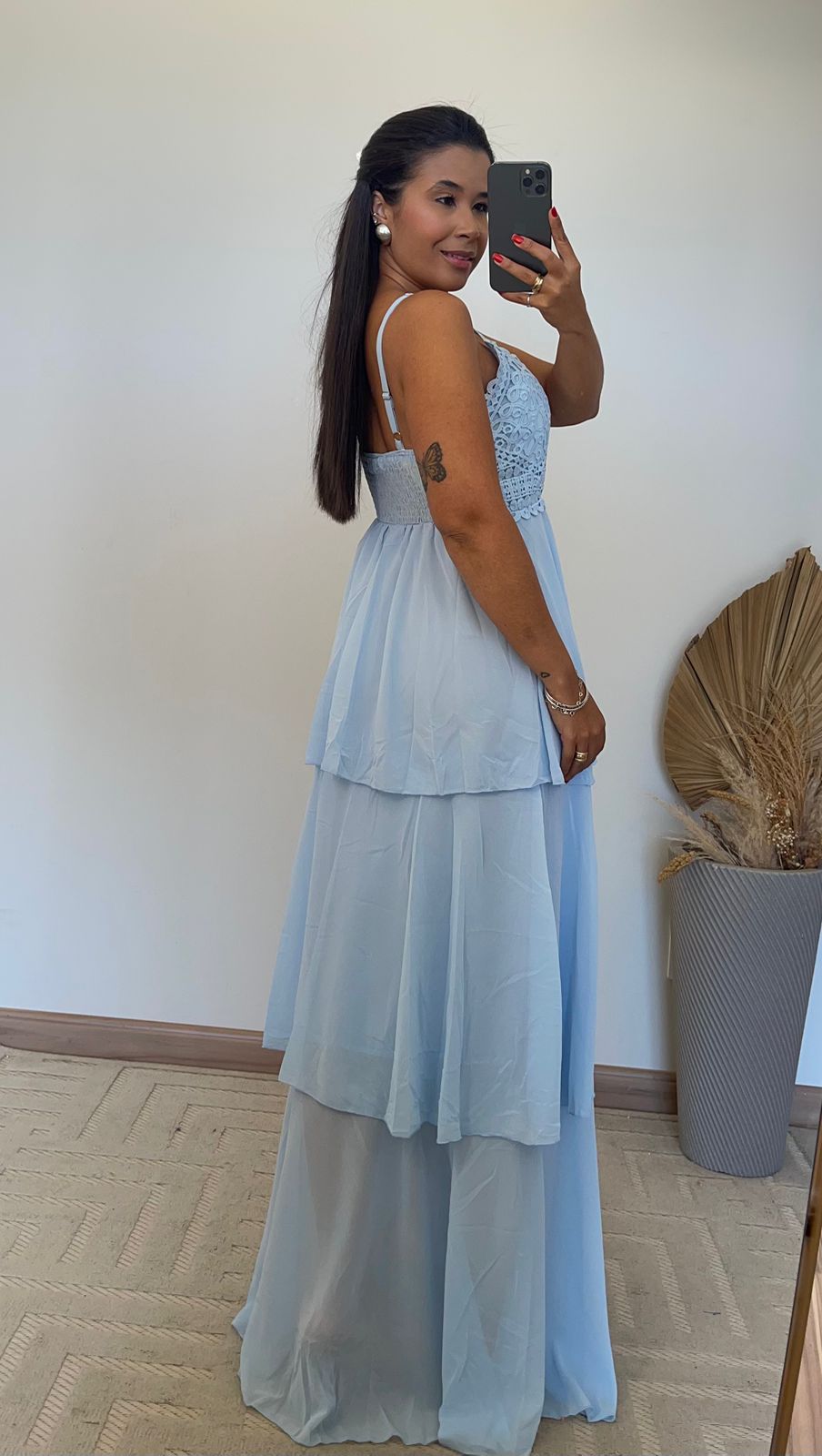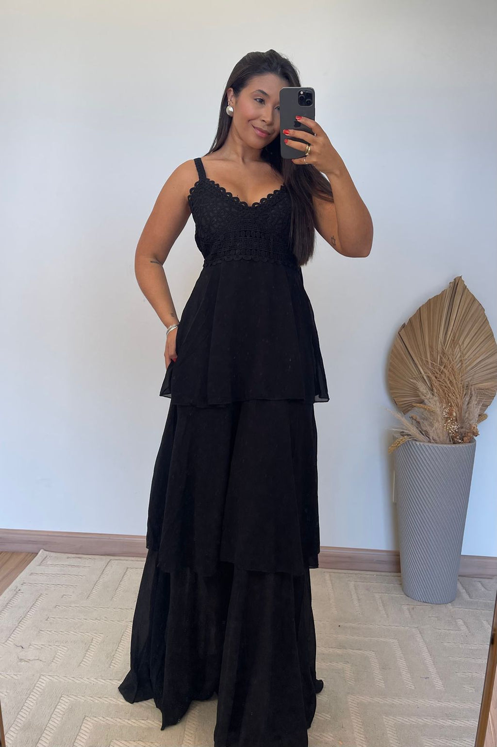 O destaque fica por conta do busto em renda trabalhada, com detalhes artesanais que valorizam o colo e proporcionam um visual delicado e feminino. A parte inferior conta com camadas fluídas de chiffon, que criam movimento e um caimento impecável, realçando a silhueta de forma leve e harmoniosa.