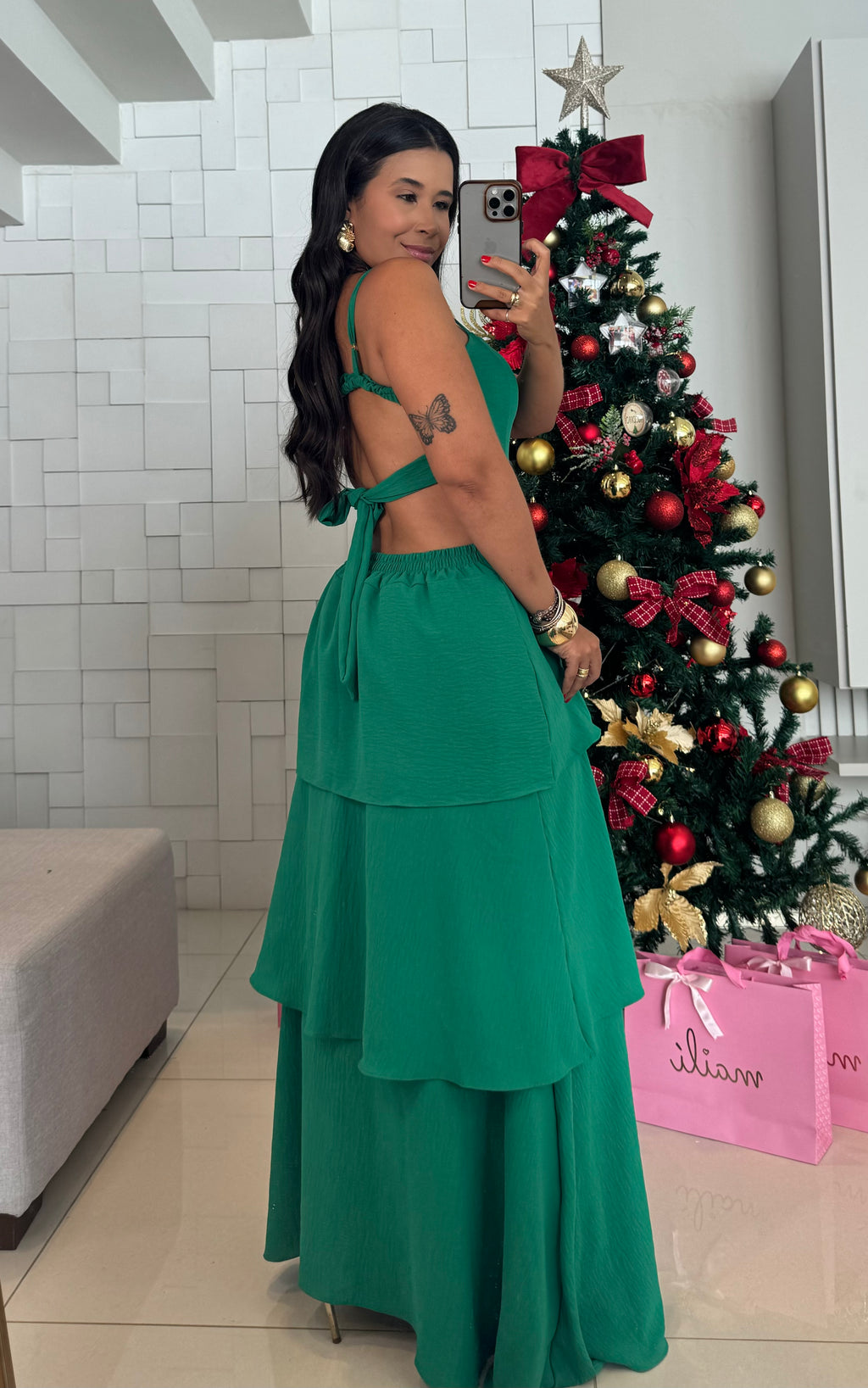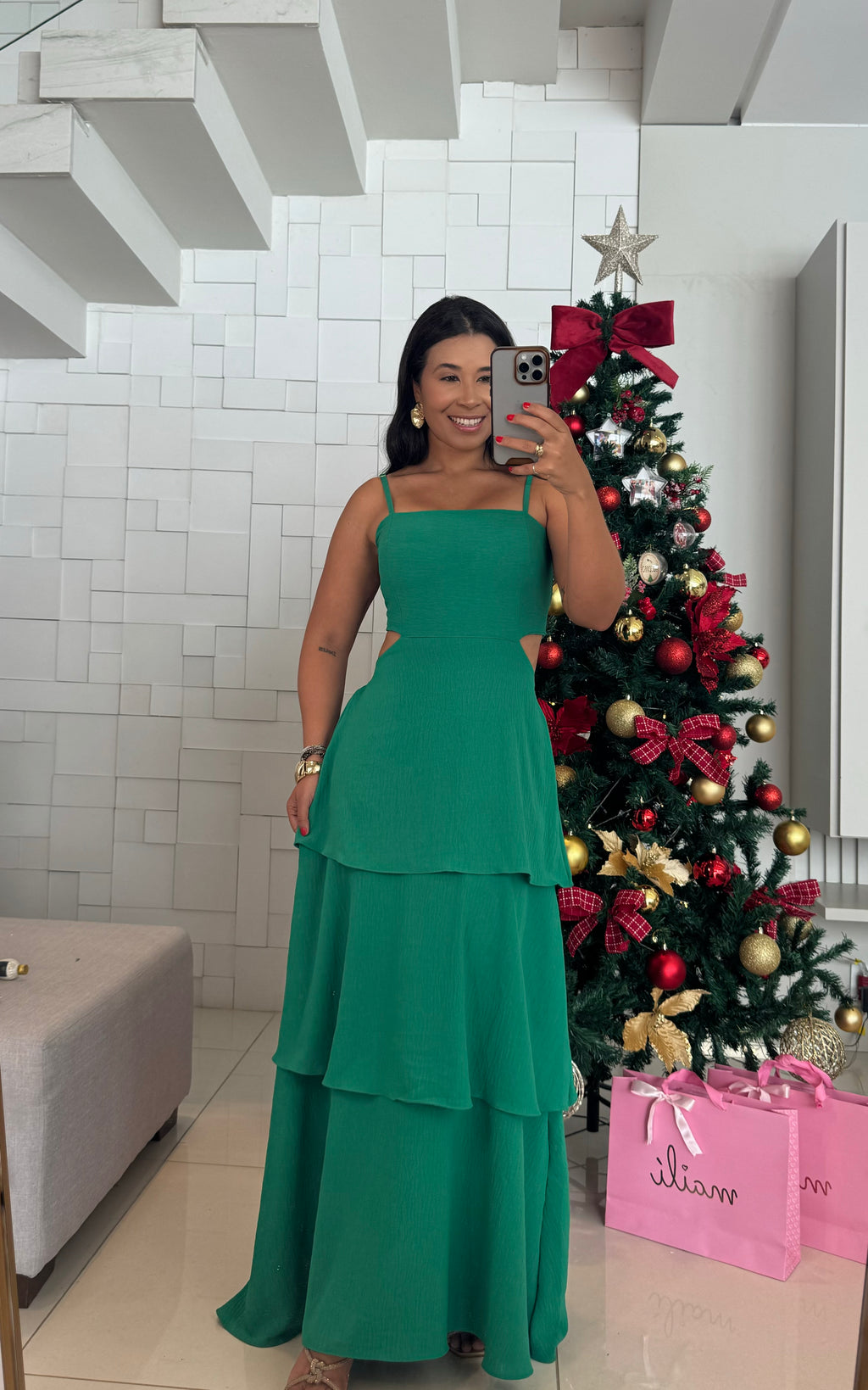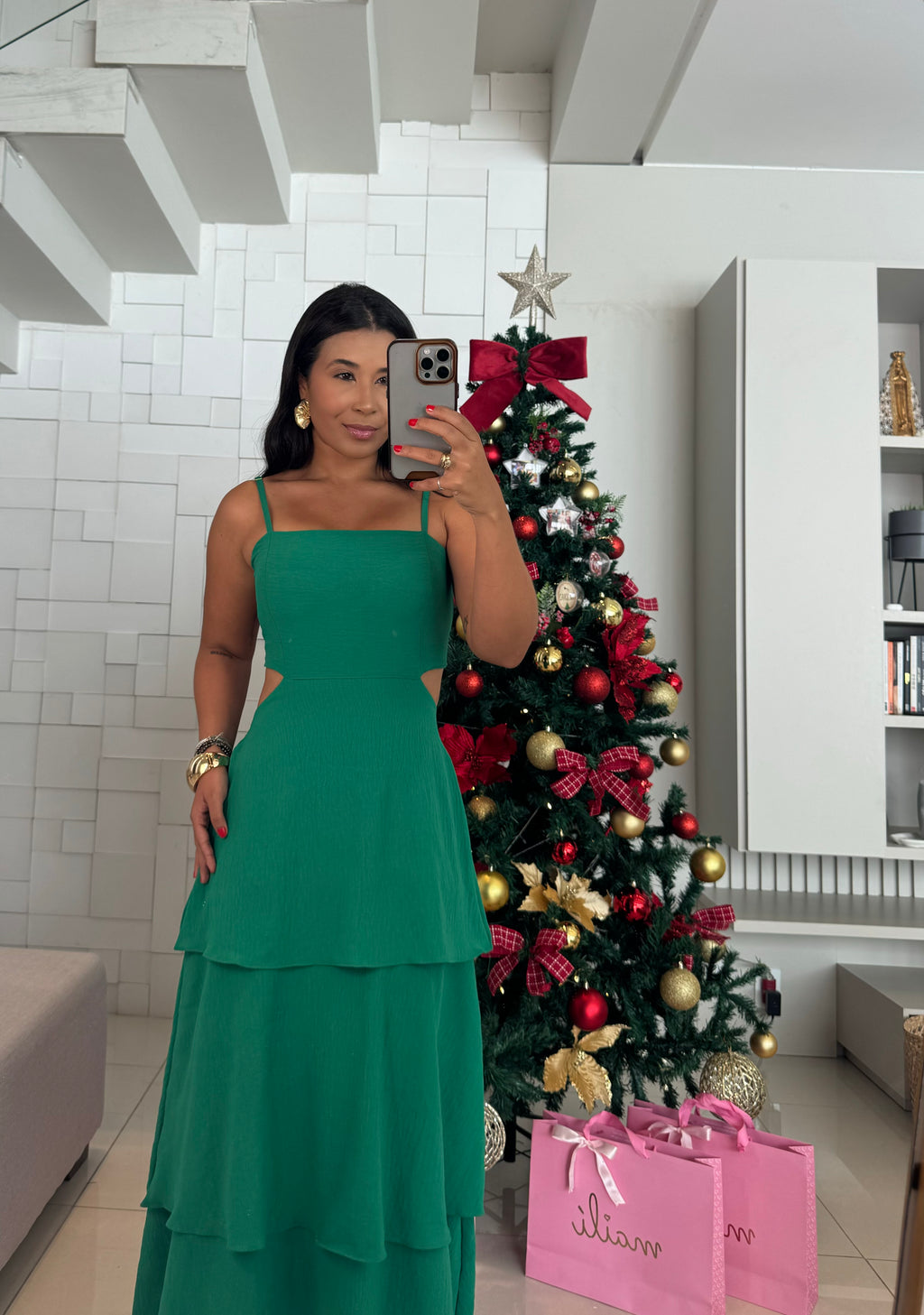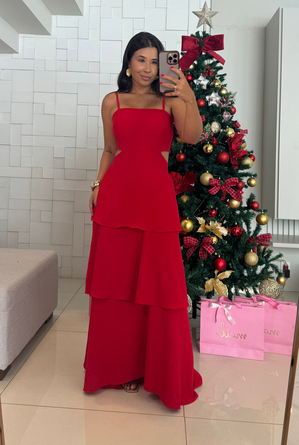 O modelo longo com babados traz um visual delicado e sofisticado, ideal para ocasiões especiais, jantares e eventos que pedem presença e charme.