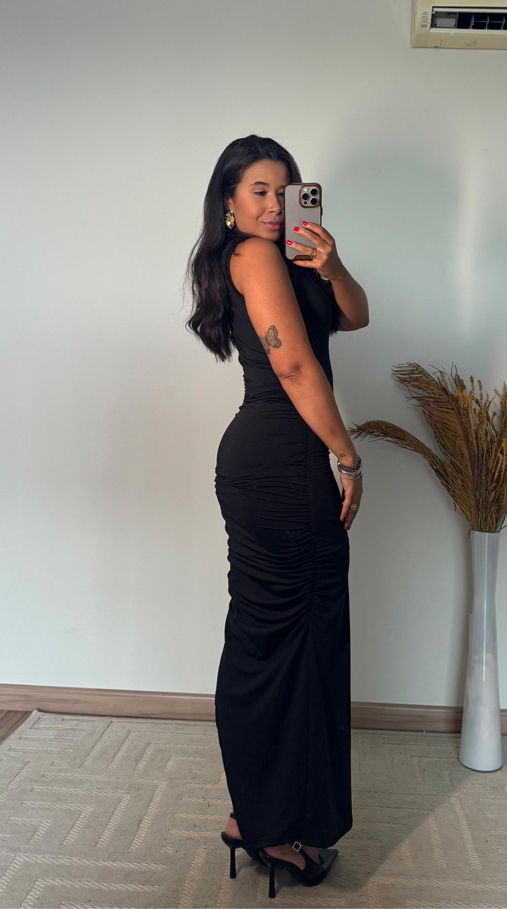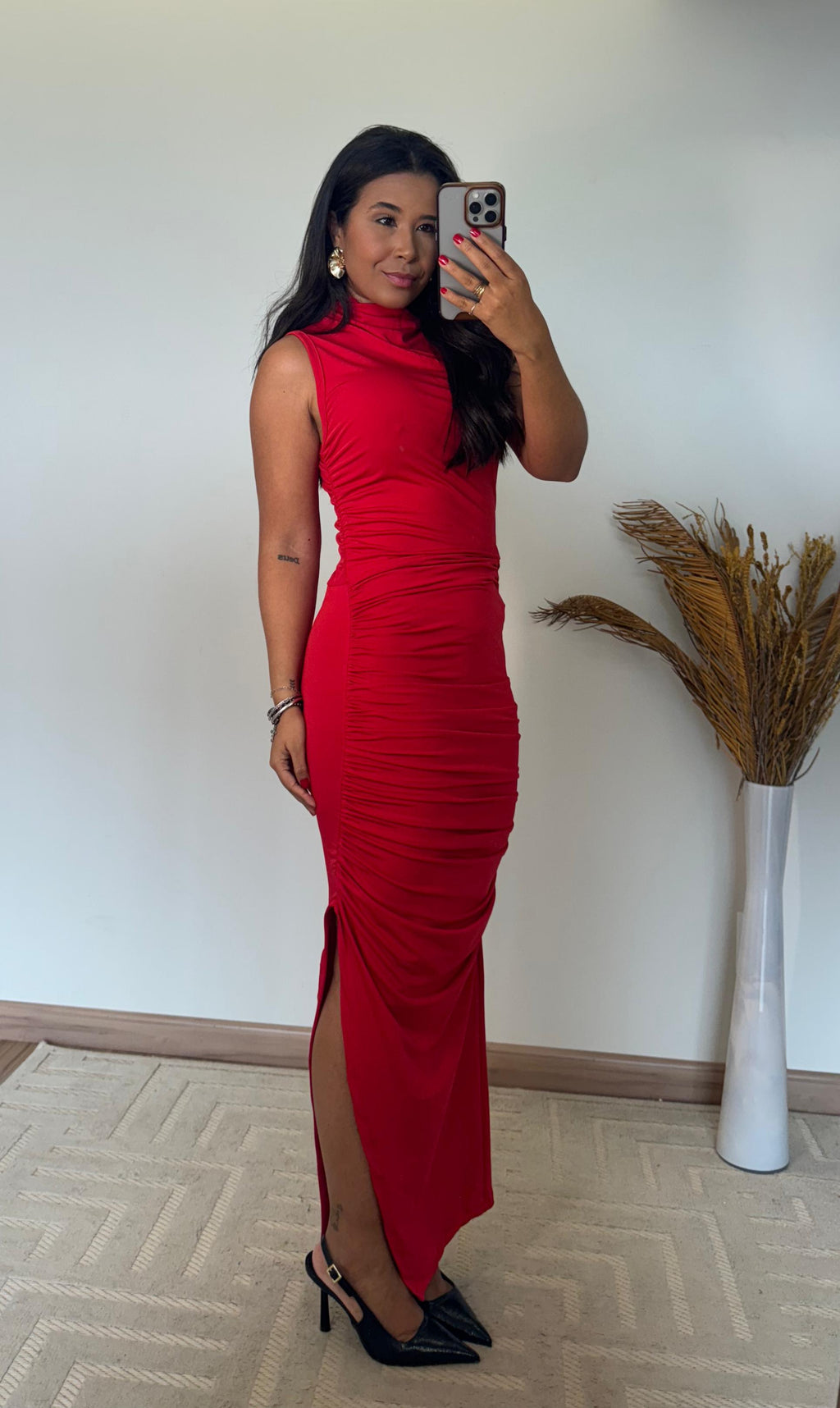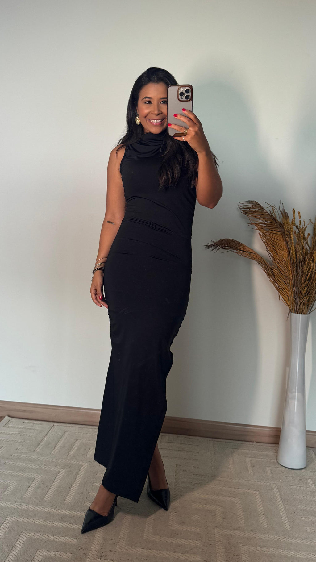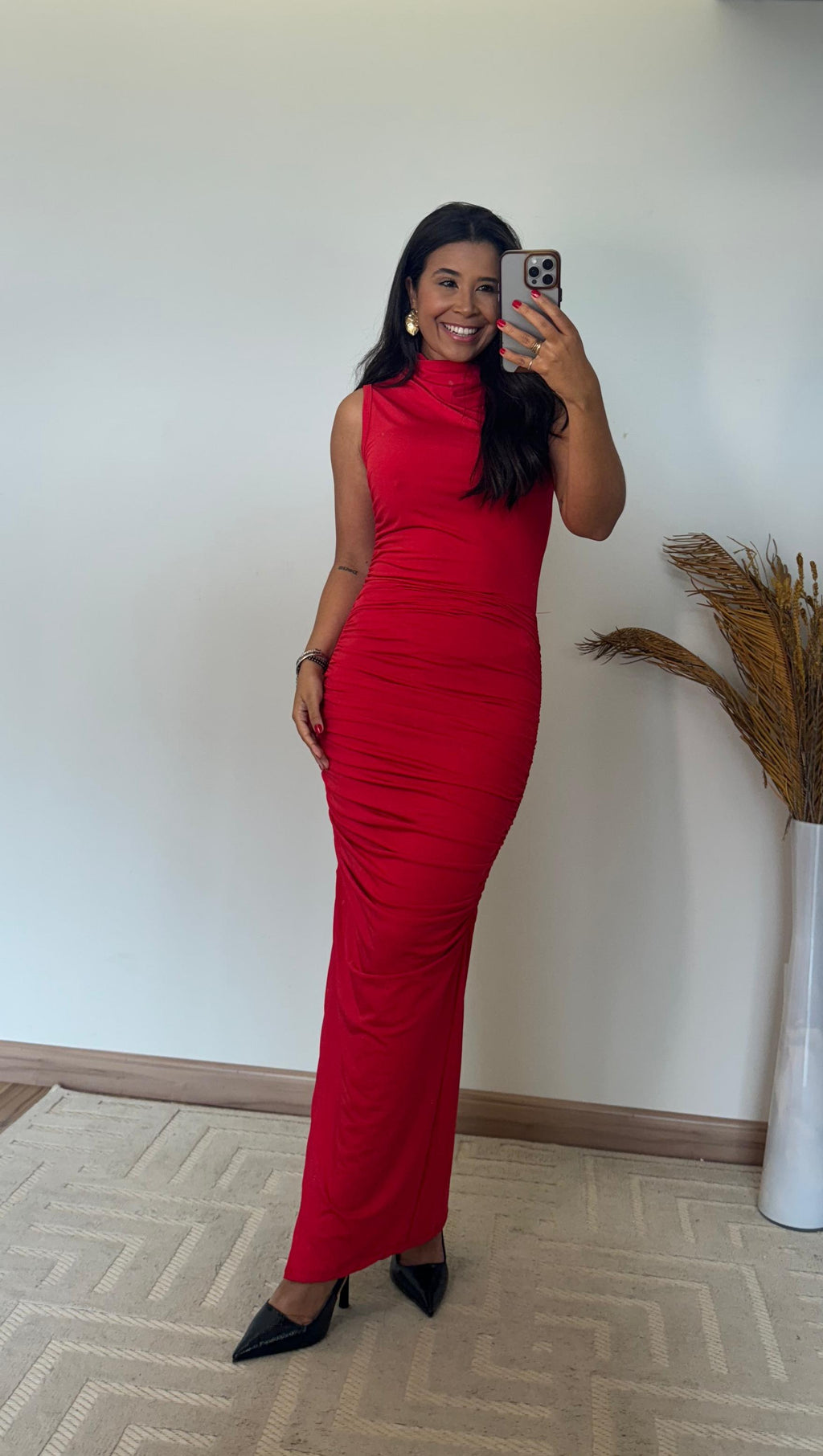 O comprimento Longuette — mais longo que o midi, porém mais curto que o longo — traz uma estética refinada e extremamente feminina, deixando o visual mais imponente e elegante. O drapeado frontal cria profundidade, disfarça imperfeições e afina visualmente a silhueta. Já o modelo justo destaca as curvas na medida certa, sem marcar ou perder o conforto.