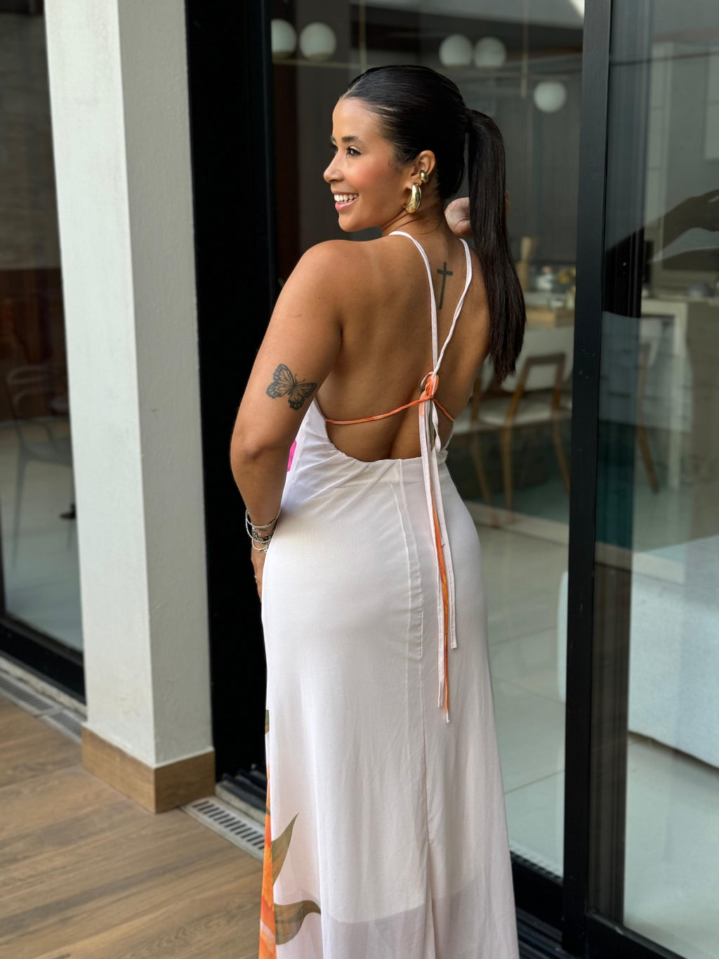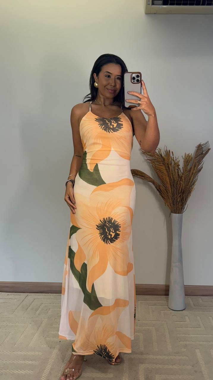 Sua modelagem longa cria uma presença marcante, enquanto a amarração nas costas adiciona charme e permite um ajuste personalizado, garantindo conforto e versatilidade. O design com costas abertas traz um toque sensual na medida certa, perfeito para ocasiões especiais, eventos ao ar livre ou produções mais refinadas.