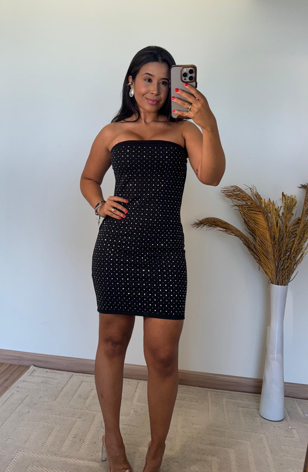 Feito para impressionar, o modelo traz aplicações delicadas por toda a parte frontal, criando um visual glamuroso e moderno. O decote tomara que caia adiciona feminilidade e alonga a postura, ideal para compor looks poderosos para festas, jantares, eventos noturnos e momentos especiais.