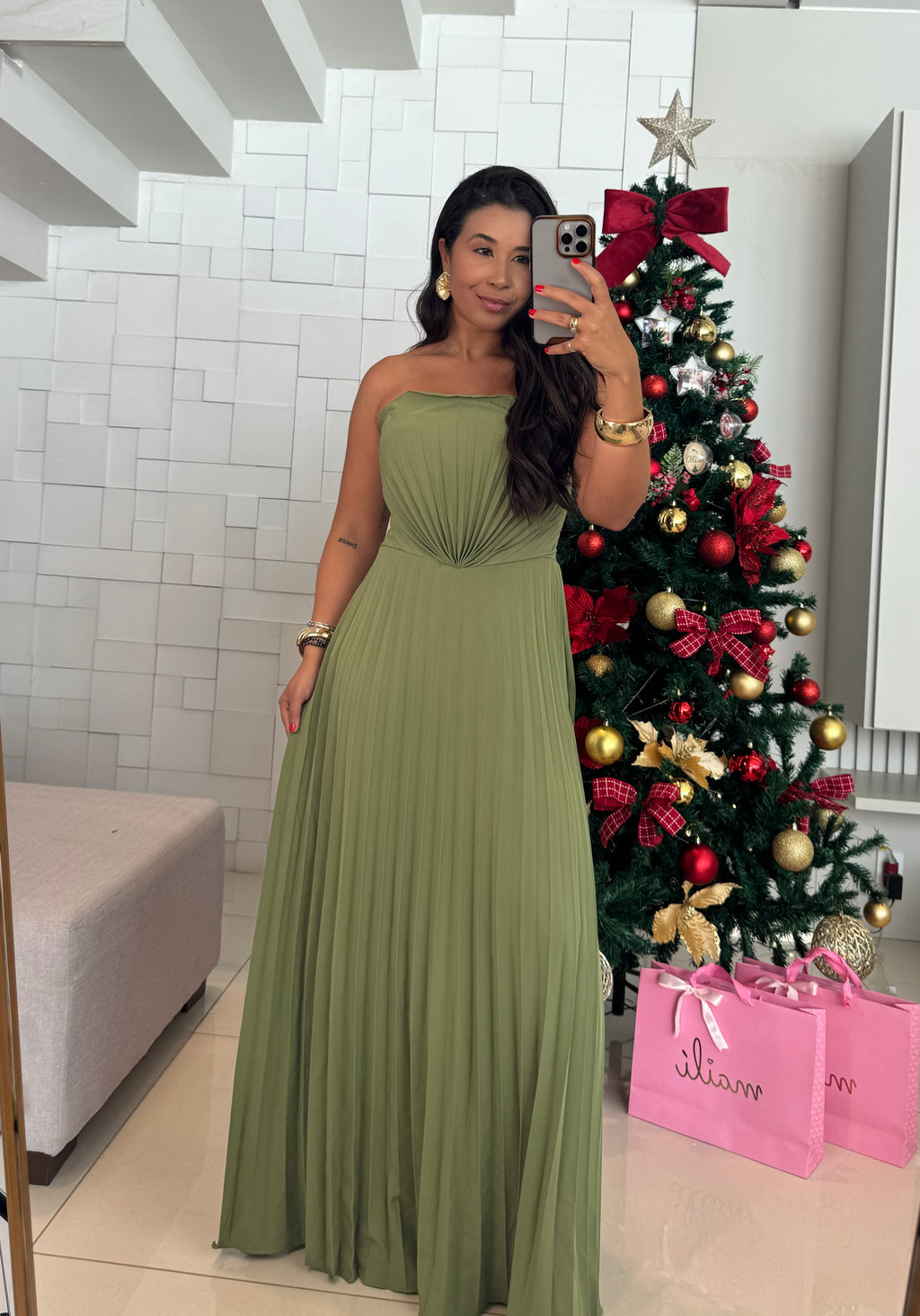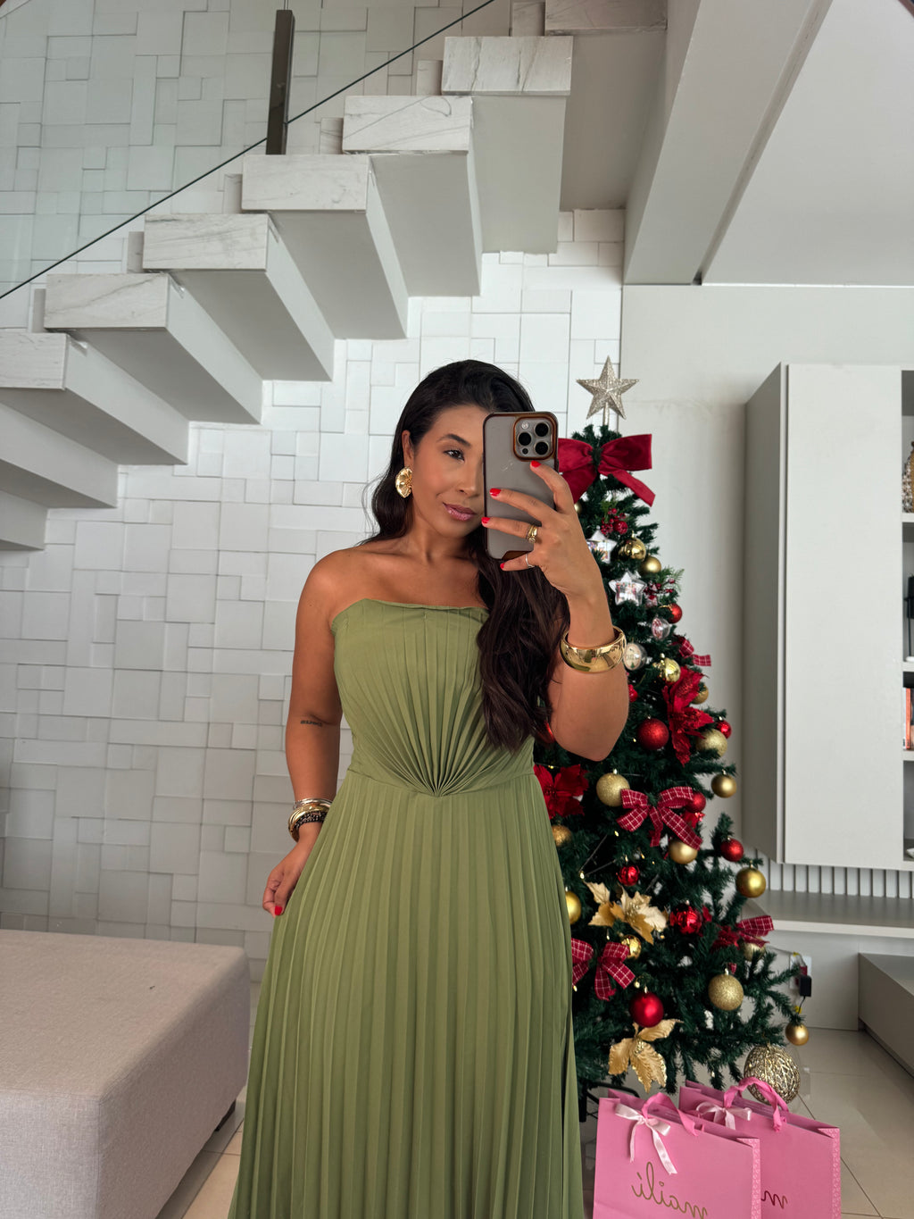 Confeccionado em tecido plissado leve e sofisticado, com textura delicada e caimento fluido que acompanha o movimento do corpo com elegância.
